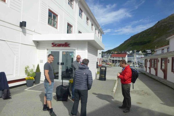Honningsvag öffnet erst um 17:00 Uhr und ein vorheriges Landen ist strickly vorbidden und Peppo mit seiner Frau warteten dort extra auf uns. Sie haben bereits zwei Tage bei Sturm und Regen am Nordkap ausgeharrt, um uns zu treffen. SHIT oder wie heisst das nette Wort, dass „Mann“ in so einer Situation verwendet???