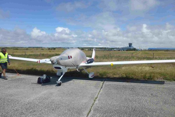 Als kleine Auflockerung kamen dann Peppo, Siggi und ihr Hund Chicko in Ihrem Landrover-Wohnwagen-Gespann vorbei. Kurzes Küsschen durch den Zaun, denn sie dürfen nicht in den Flugplatz rein. Er ist ja geschlossen. So wird durch den Zaun gesprochen Erlebnisse ausgetauscht und wieder verabschiedet. Siggi machte noch das Foto von mir, wo ich gestützt mehr oder weniger zum Flieger getragen werde.